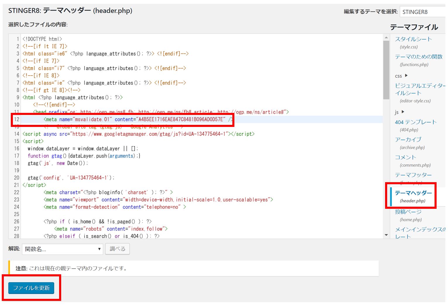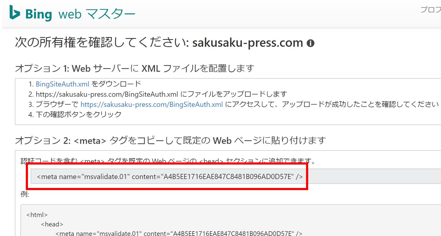 『オプション 2: <meta> タグをコピーして既定の Web ページに貼り付けます』に記載されている、<meta> タグを、WordPressの『テーマヘッダー (header.php)』ファイルへ埋め込みます。
