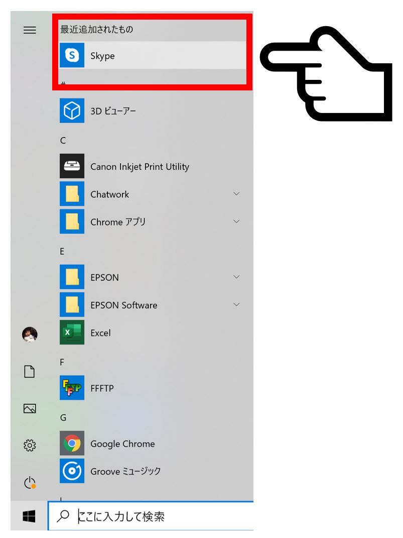 Windowsのスタートメニューから『最近追加されたもの』のところに、Skypeアイコンが見えますので、こちらをクリックして、スカイプを起動します。