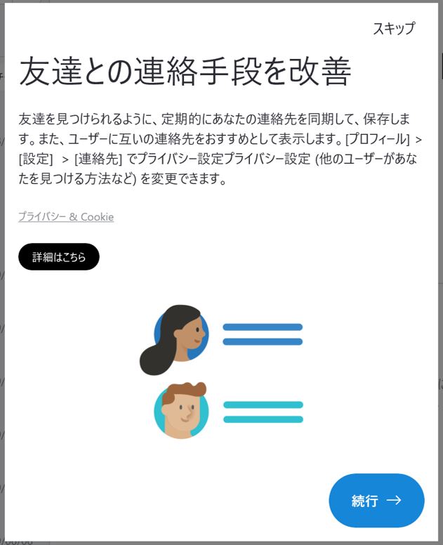 以下画面になりますが、こちらは右上の『スキップ』でも『続行』でも構いません。