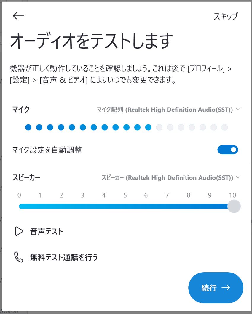 すると、オーディオテストの画面になりますので音声反応が問題無ければ『続行』をクリックして進みます。