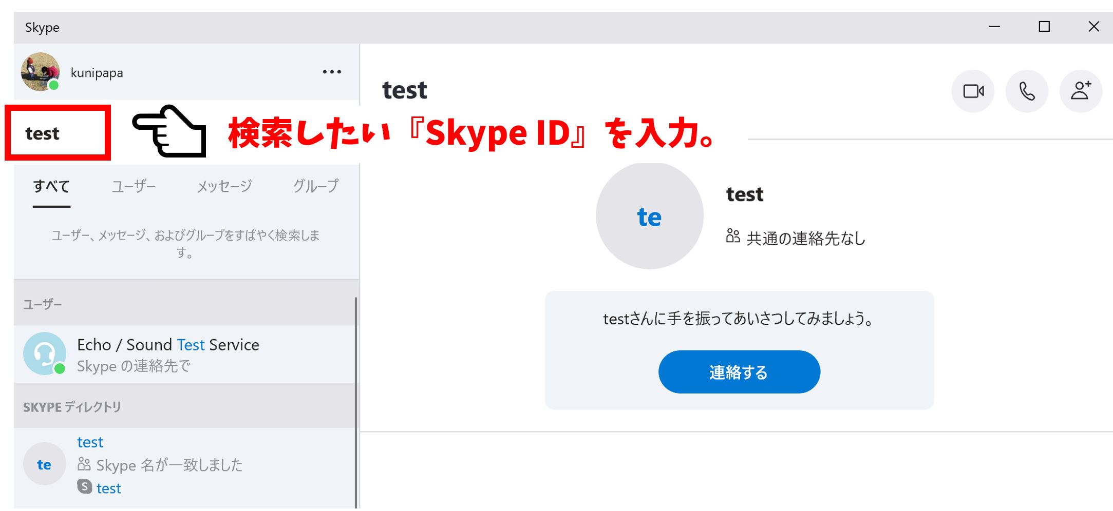 下記、スカイプのメイン画像が表示されますので、ここからコンタクトに追加したい相手の『Skype ID』を入力し検索します。(Skype IDが被っていることもあるので、アイコン設定などがされている相手の場合は、きちんとそこについても確認しておきましょう。)